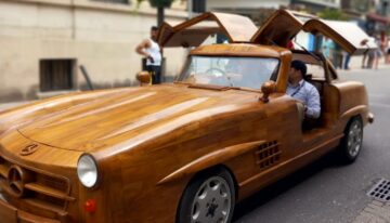 The wooden replica of the Mercedes 300 SL Gullwing will be auctioned on November 16 on the website www.rouillac.com, with an estimated price of €15,000 — far less than the original model, which costs at least €1.5 million.