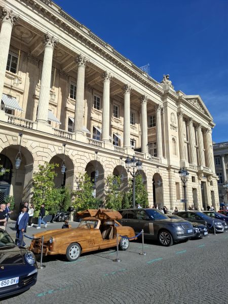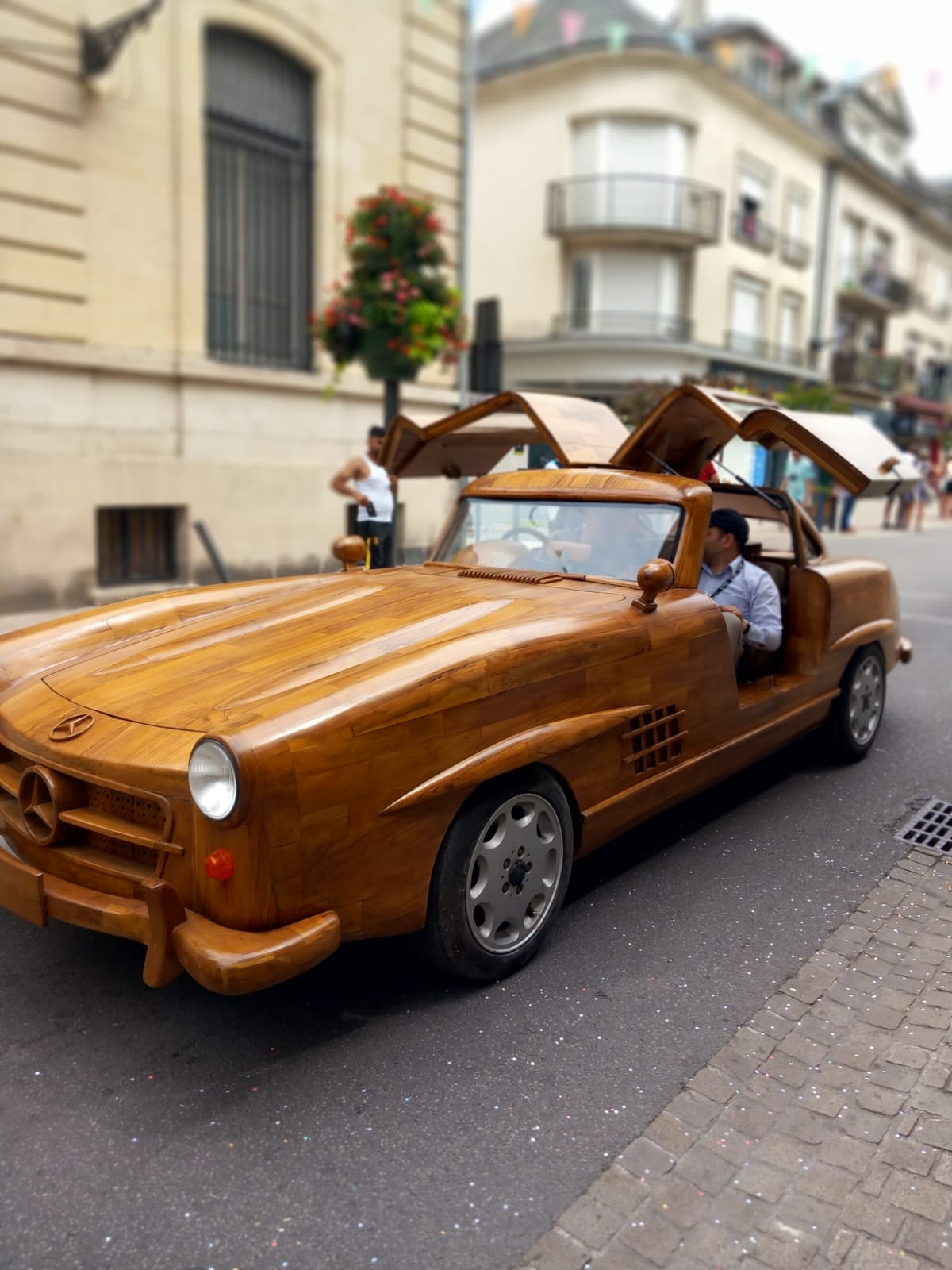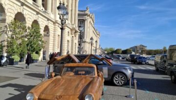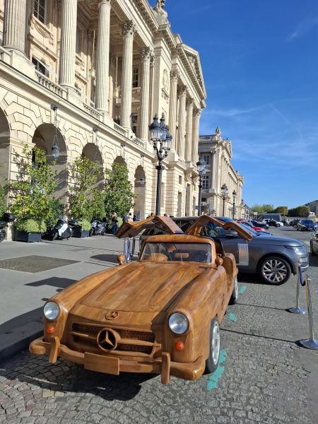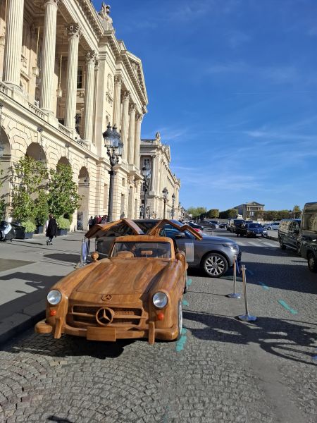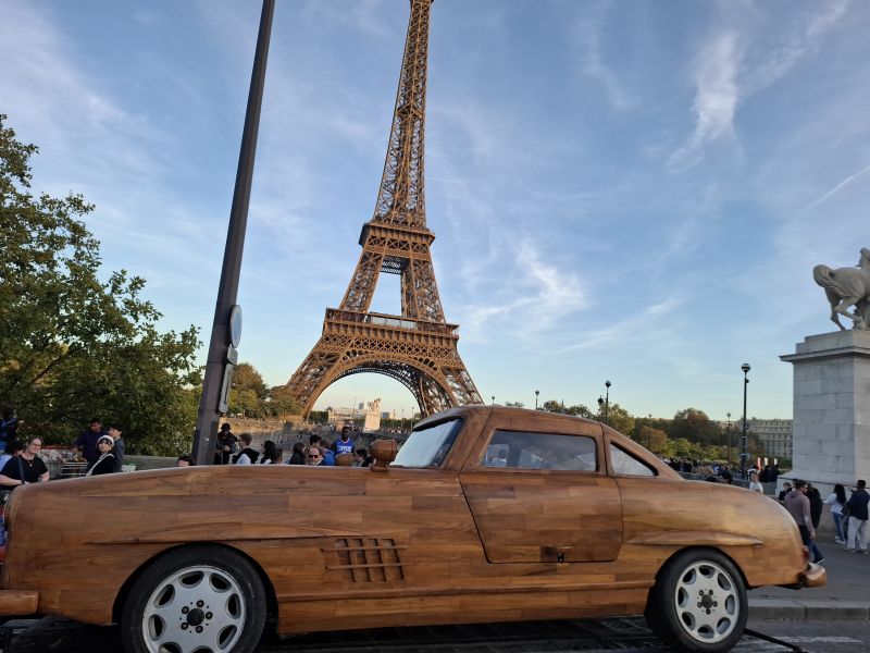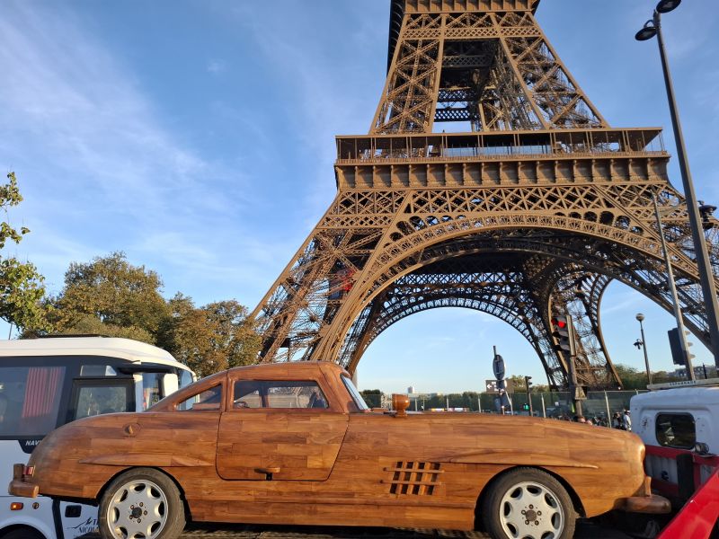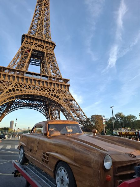 This time, however, the work was more complex, as Le Forestier had to combine artistry with mechanics. Beneath the teak wooden body of this Mercedes 300 SL lies the platform of a 1989 Mercedes E 300. The car is powered by an engine paired with a 4-speed manual transmission, capable of reaching a top speed of 80 kphh, with the mechanical work handled by mechanic Pierre Chabrier.