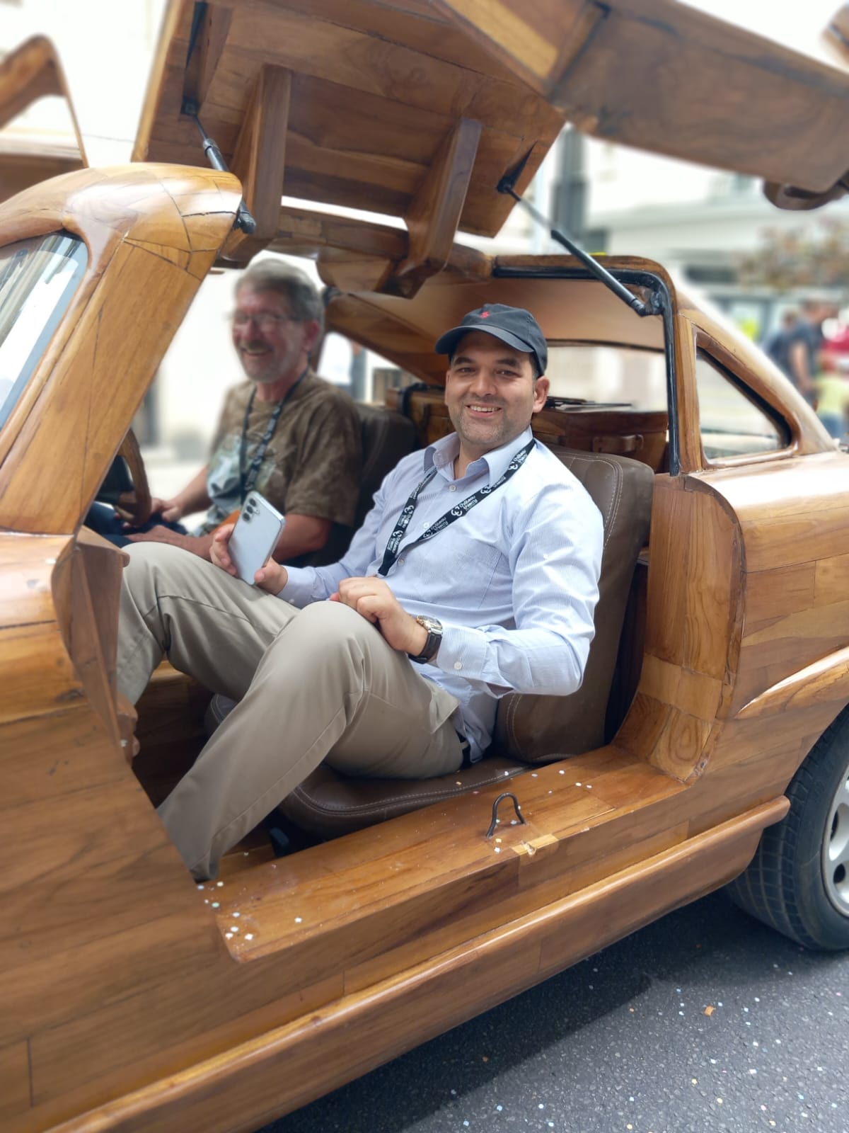 Measuring 5 meters long, 1.80 meters wide, and 1.45 meters high, the wooden replica is 48 cm longer, 1 cm wider, and 15 cm taller than the original. The seats are upholstered in brown leather, and the steering wheel is on the right-hand side.