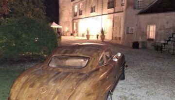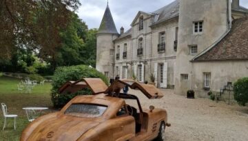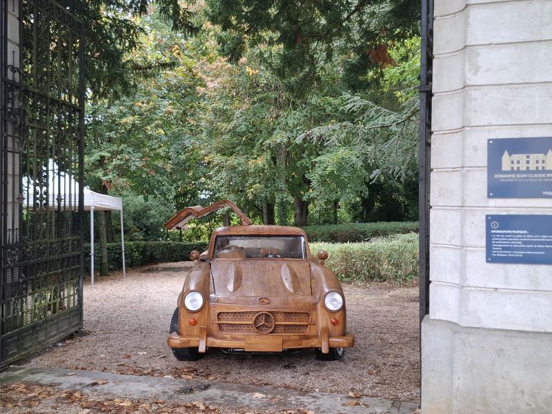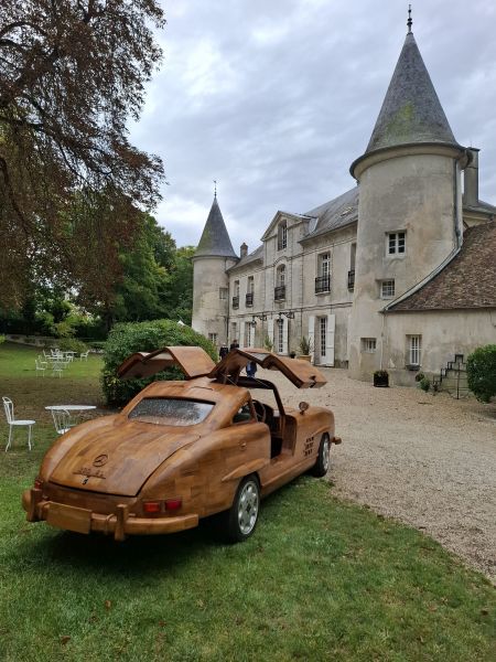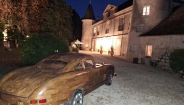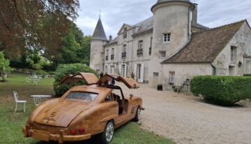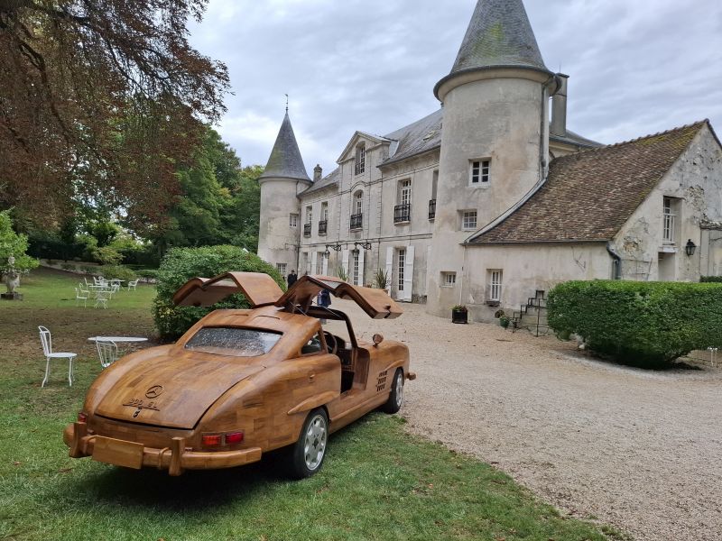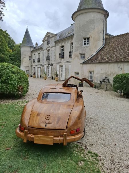 The 300 SL Gullwing’s wooden body was crafted entirely by hand, totaling 8,000 hours of work, with Le Forestier assisted by five people. The gullwing doors, trunk lid, and hood are all fully functional. Named “Belle Castelle,” this unique creation continues the tradition of wooden automobiles, following in the footsteps of the Hispano-Suiza H6 B Nieuport Tulipwood (1924), commissioned by André Dubonnet, and Michel Robillard’s 2CV, sold at Château d’Artigny on June 4, 2023.