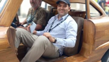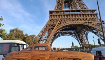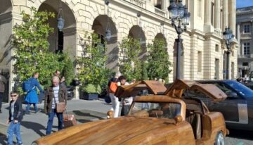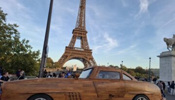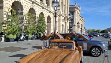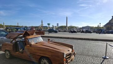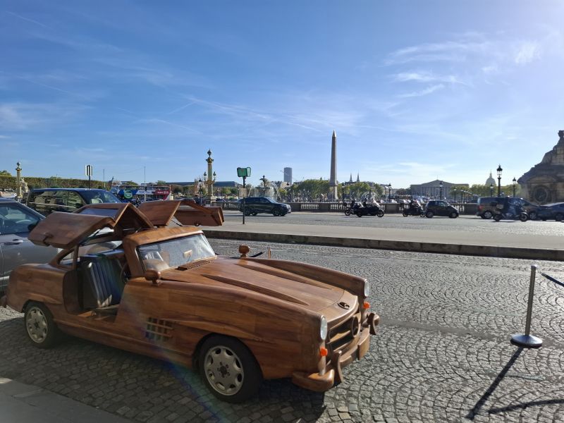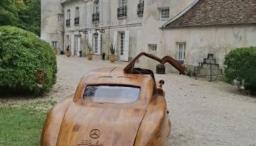 This magnificent Mercedes 300 SL Gullwing is hand-carved and sanded from teak wood by art carpenter Remy Le Forestier (born in 1985), who became famous for creating a replica of dictator Bokassa’s throne and, most notably, for crafting the desk delivered to Donald Trump at the White House.