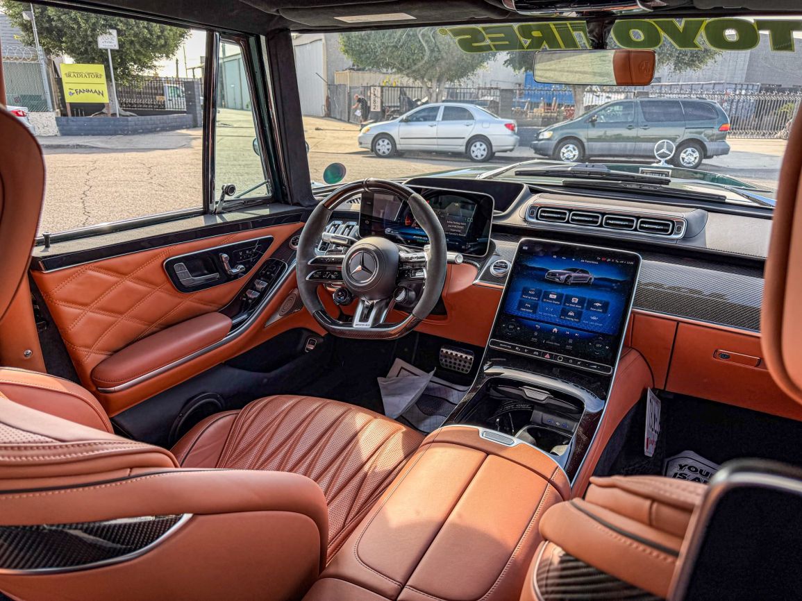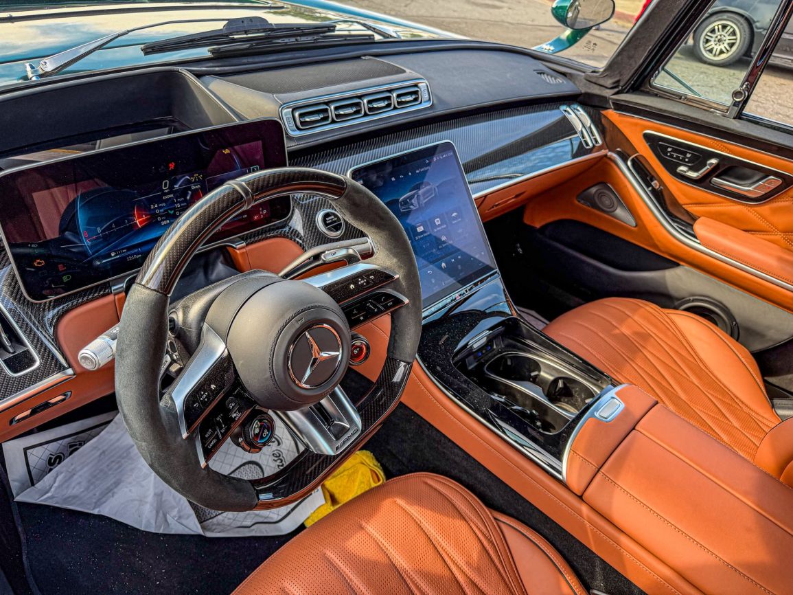 The interior mirrors that of the S-Class, with a 12.8-inch portrait-oriented OLED touchscreen, a 12.3-inch digital instrument display, the AMG Performance steering wheel, and AMG sport seats upholstered in Nappa leather.