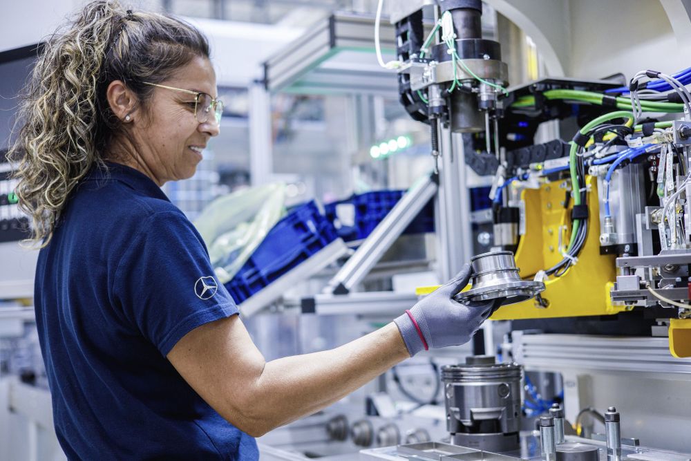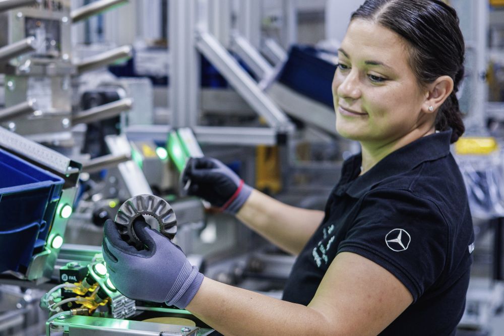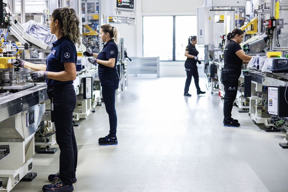 To support electric motor production, Mercedes built a new manufacturing facility covering an area of 30,000 square meters — 15,000 of which are dedicated to the production line itself. The production line stretches 1,000 meters long and includes 200 manual and automated workstations.