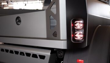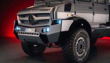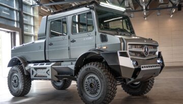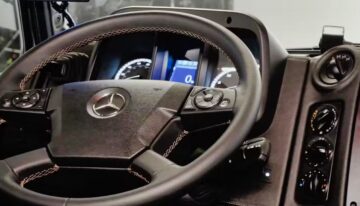 The interior is limousine-level luxurious, featuring fine leather upholstery and leather floor mats. With this Unimog, the Mercedes-Benz Special Trucks division says it has “set new standards in this segment and fulfilled the wish of many Unimog customers: to complement the Unimog’s decades-long, nearly unrivaled off-road capabilities with even greater power and a distinctive design.”