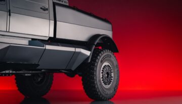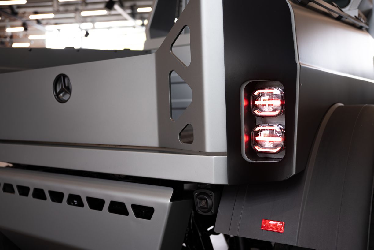 Based on the double-cab U 4023, the anniversary model has an SUV-inspired exterior, according to the manufacturer, and comes with matte gray paintwork, 20-inch aluminum beadlock wheels fitted with 365/85 tires, a distinctive lighting concept with modern LED headlights integrated into a redesigned front bumper, an LED light bar on the roof, and the MirrorCam system with digital cameras and monitors instead of exterior mirrors.