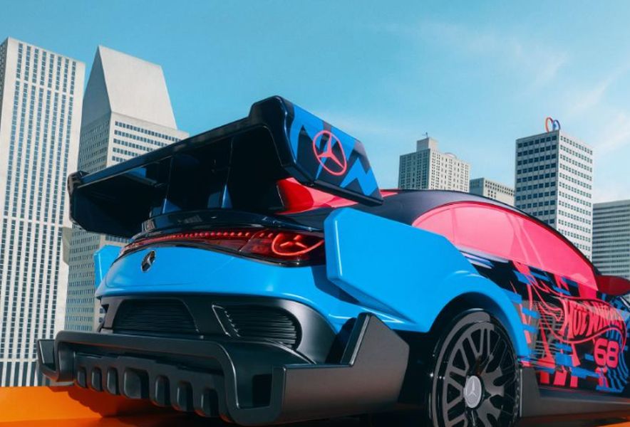 The Hot Wheels flame logo is visible on the doors, all windows are tinted pink, the rear diffuser is as massive as that of a DTM car, and the huge black rear wing features the Mercedes-Benz inscription. Oversized flames lend it a retro-futuristic look reminiscent of 1980s pop culture.
